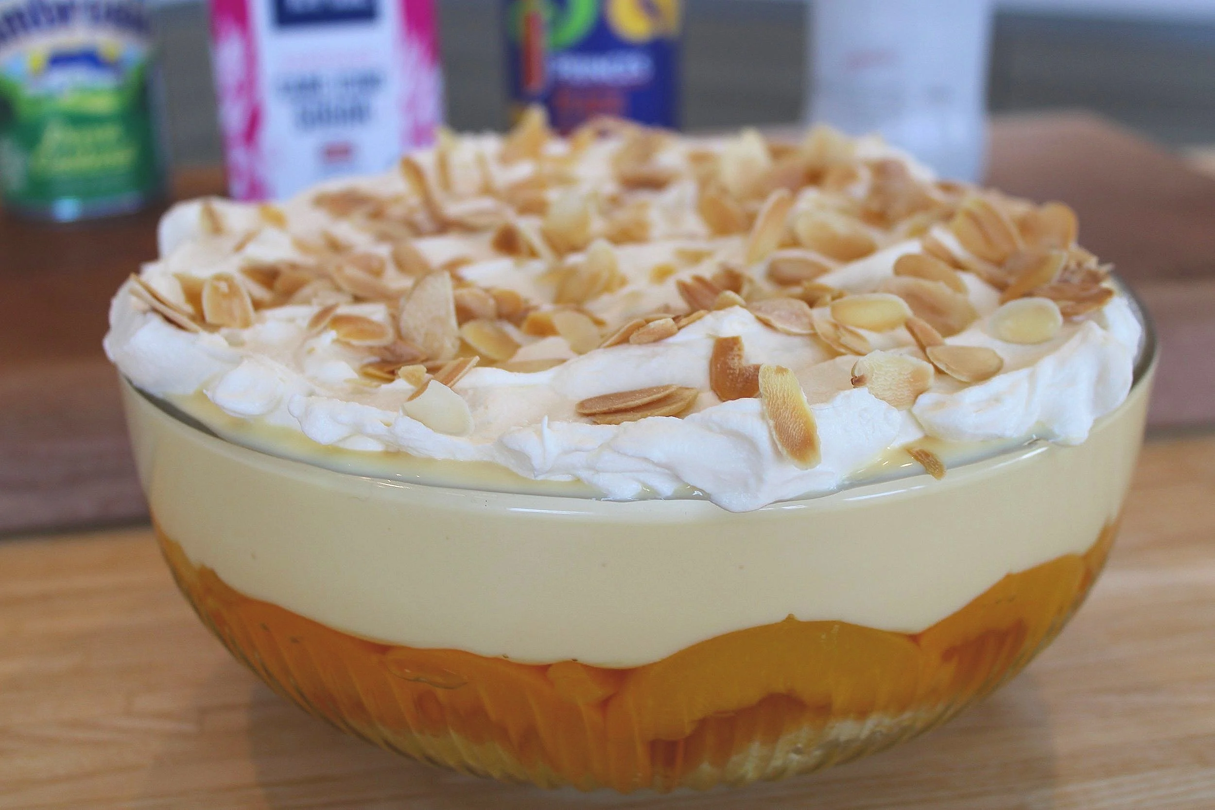 -Slice the Swiss roll and dip Dip in the peach Liquor and layer them in the bottom of a trifle dish.